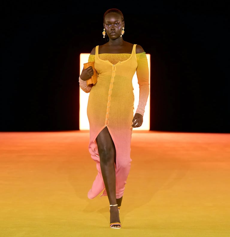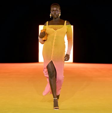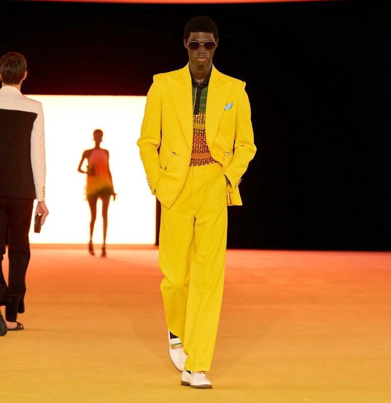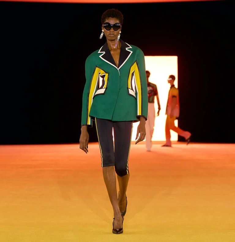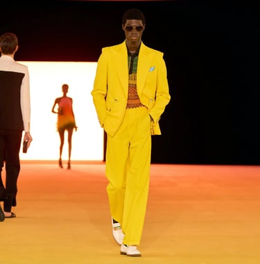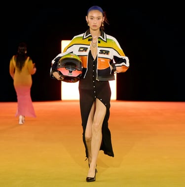 Presented on the occasion of Nigeria's 63rd independence anniversary, the Day of Victory" collection is a love letter to the country's rich culture, blending Afrofuturist motifs. Biker jackets with bikinis, beaded vests with patent shorts and suits imbued with the brand's heart-shaped monogram... With a special nod to the legacy of Fela Kuti, pioneer of afrobeat and pan-African political activist.